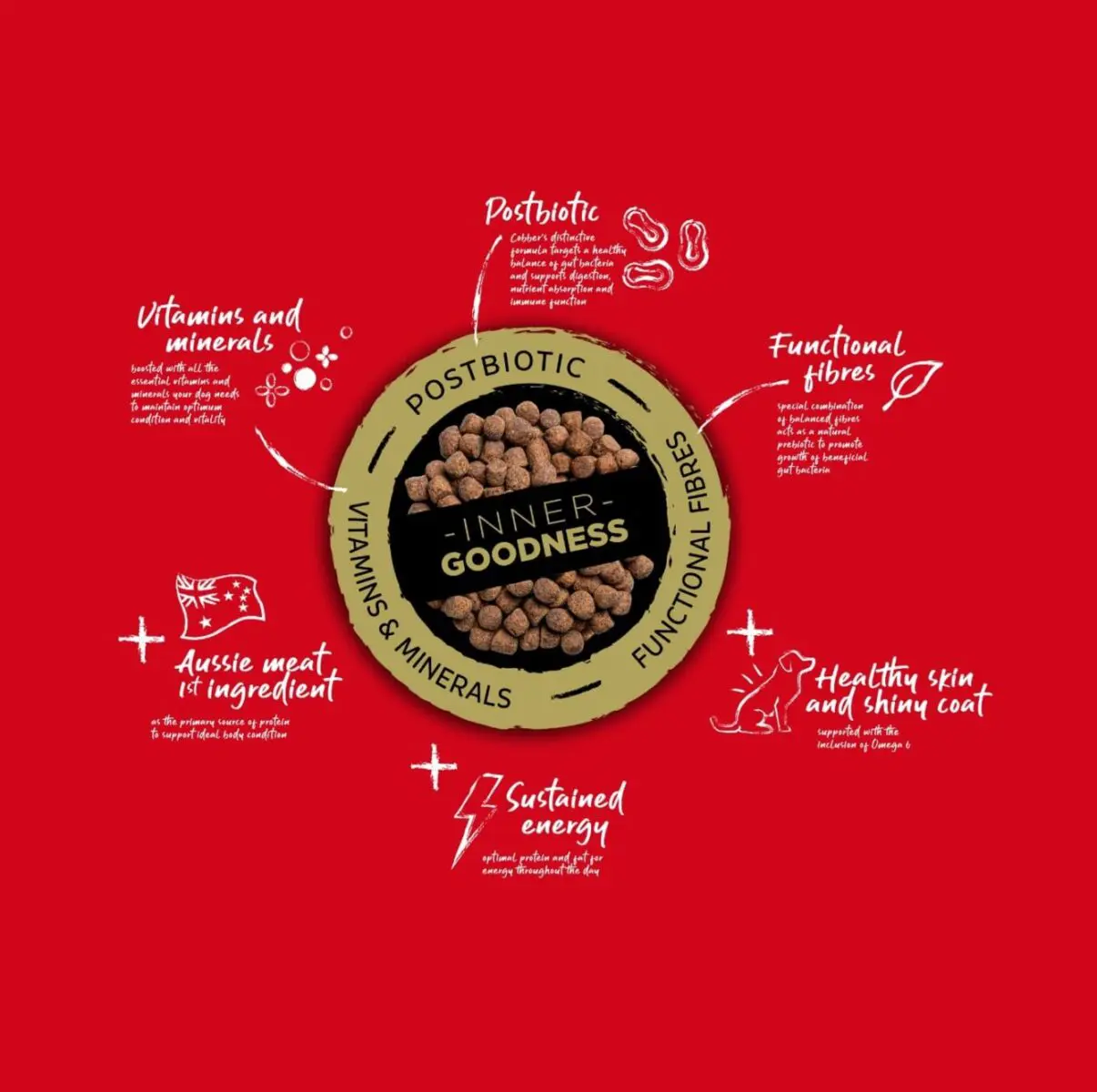 Cobber Adult with Beef is a quality Australian beef dog food suitable for all breeds of adult dogs between 1-7 years. Built with Cobber’s Inner Goodness, a unique combination of vitamins and minerals, postbiotic and functional fibres, this beef flavoured adult dog kibble keeps your dog happy on the outside and healthy on the inside.