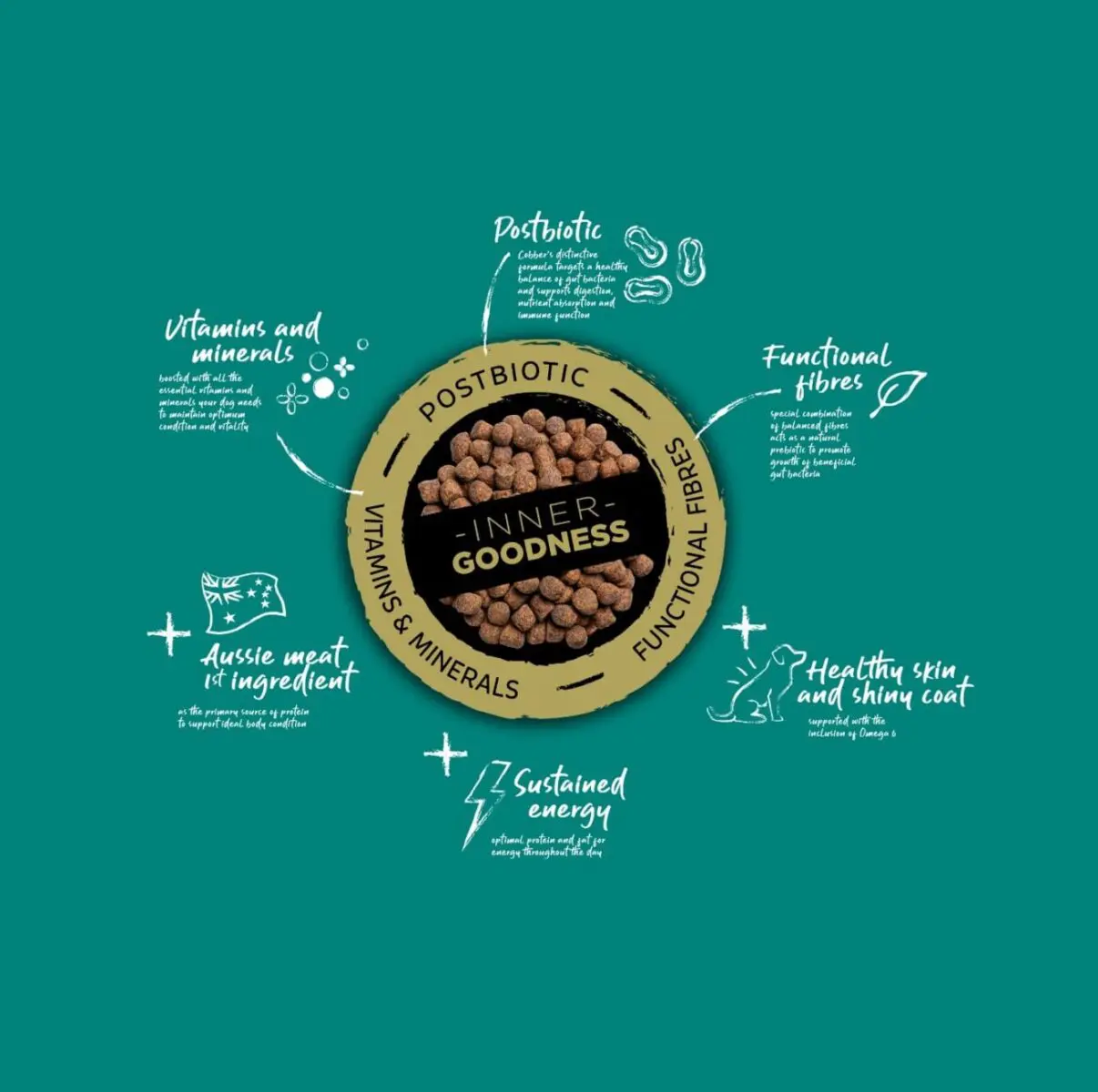 Cobber Adult with Chicken is a quality Australian chicken flavoured dog food suitable for all breeds of adult dogs between 1-7 years. Built with Cobber’s Inner Goodness, a unique combination of vitamins and minerals, postbiotic and functional fibres, this premium chicken flavoured kibble keeps your dog happy on the outside and healthy on the inside.