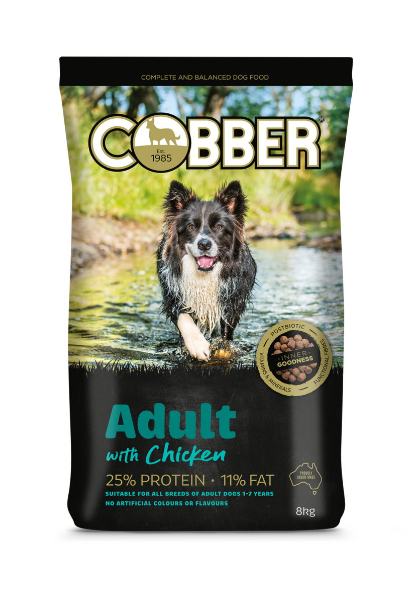 Cobber® Adult with Chicken is a well-balanced, complete chicken flavoured dog food, meeting the nutritional levels established by the Association of American Feed Control Officials (AAFCO) for maintenance of adult dogs.